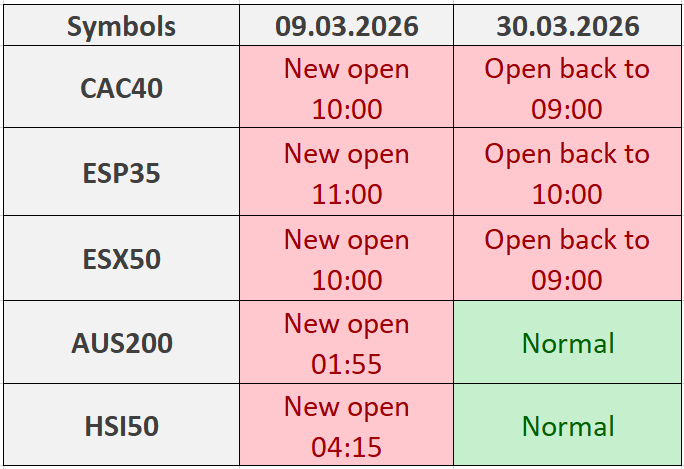 Please note that on March 9 and on March 30 the trading schedule for some trading instruments will change due to the transition to daylight saving time.