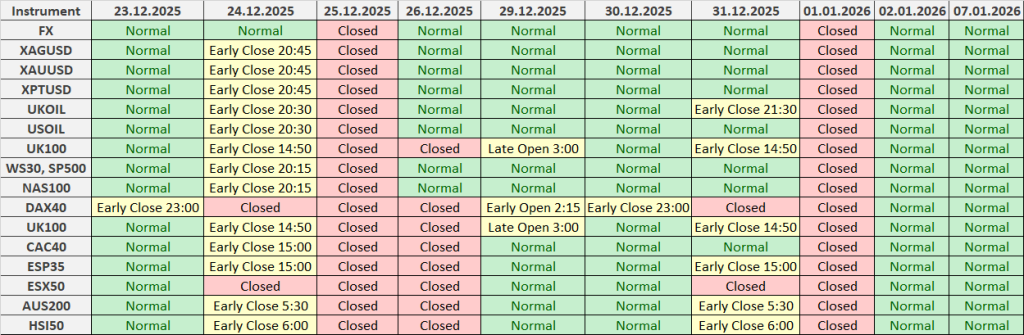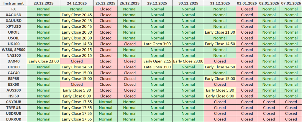 Informamos que, devido aos feriados de Natal e Ano Novo em diversos países, os horários de negociação de todos os instrumentos financeiros estarão sujeitos a alterações.